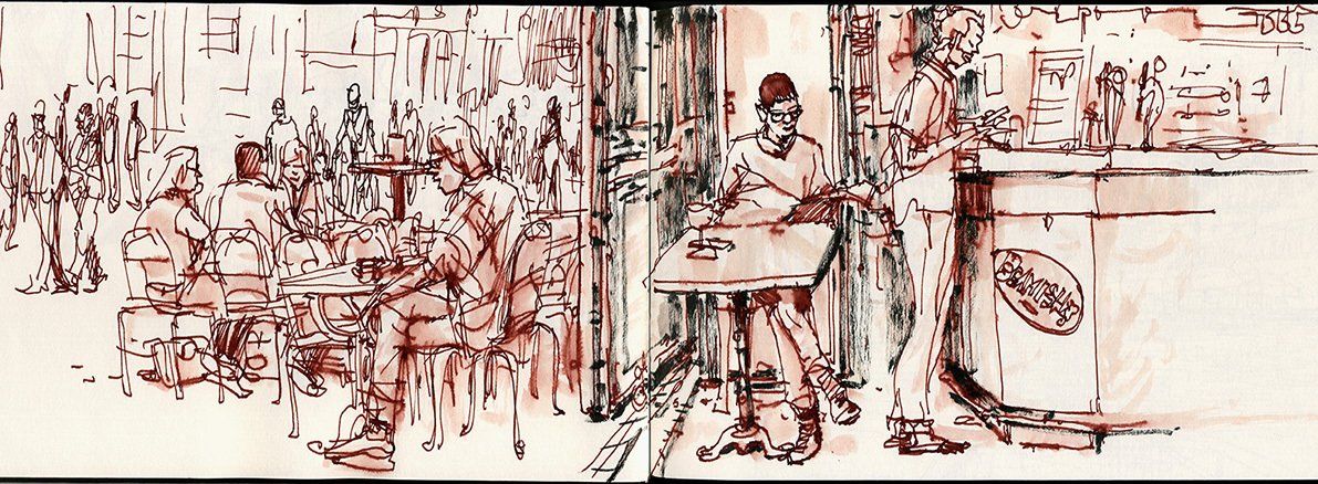 "Bistrot" -MontreuilPulsanteFountain pen + water on paper 21X42 cm.