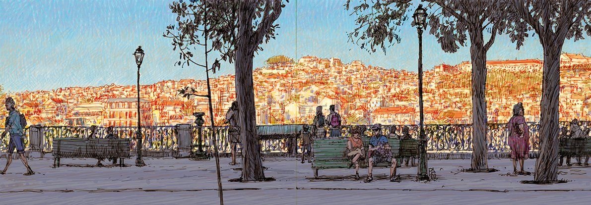 "Miradouro San Pardo" -LisbonPulsanteFountain pen on paper + digital colors 21X42 cm.