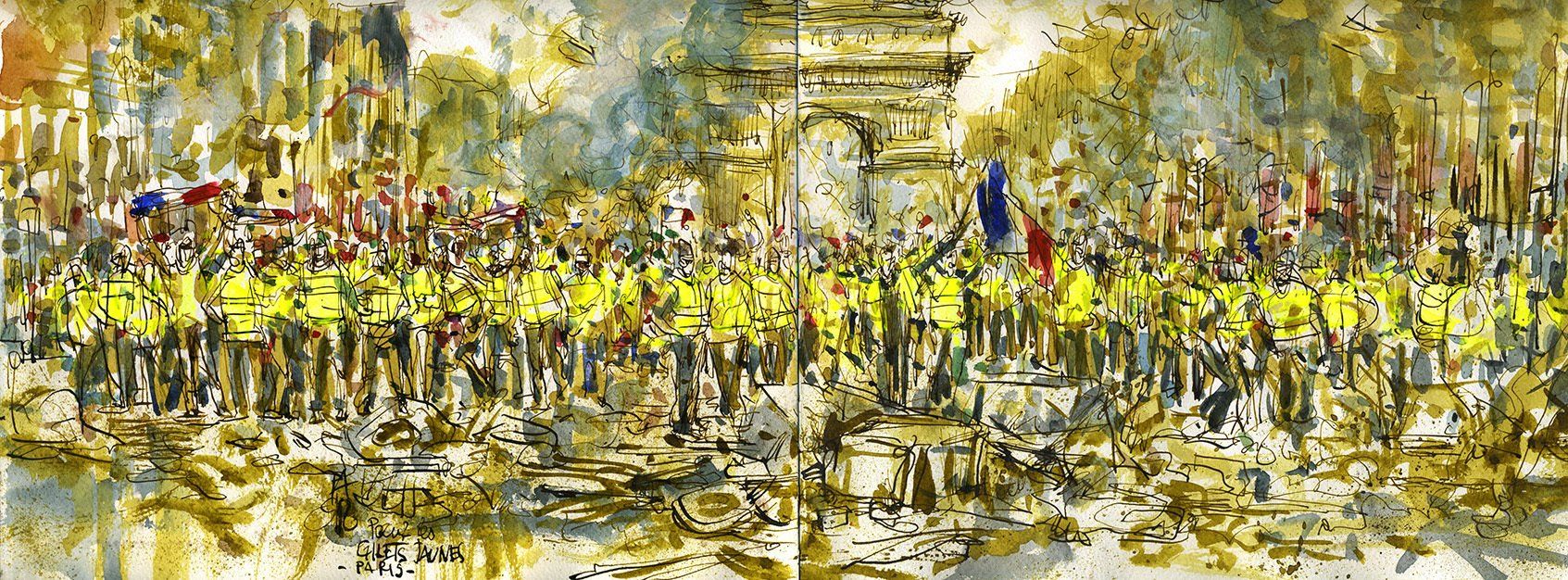 "Gilets jaunes" -ParisPulsanteWatercolor on paper 21X42 cm.